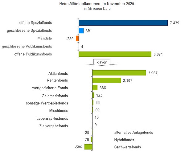 Per Ende November 2025 verwaltete die Fondsbranche 4,8 Billionen Euro für Anleger in Deutschland. Davon entfallen 2,3 Billionen Euro auf offene Spezialfonds, 1,8 Billionen Euro auf offene Publikumsfonds und 0,7 Billionen Euro auf Mandate.