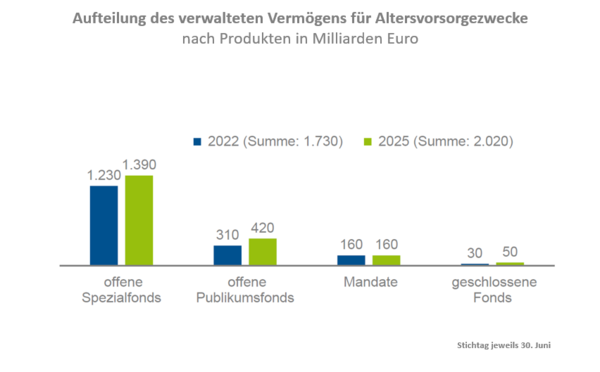 Hinter dem für die Altersvorsorge verwalteten Vermögen der Fondsgesellschaften stehen insbesondere die betriebliche Altersvorsorge mit 590 Milliarden Euro, kapitalbildende Lebensversicherungen mit 530 Milliarden Euro sowie berufsständische Versorgungswerke von zum Beispiel Ärzten, Apothekern und Rechtsanwälten mit 520 Milliarden Euro. Zur betrieblichen Altersvorsorge gehören vor allem Direktzusagen (280 Milliarden Euro) und Pensionskassen (180 Milliarden Euro). Auf die Zusatzversorgung der Beschäftigten bei Bund, Ländern und Gemeinden sowie den Kirchen entfallen 180 Milliarden Euro. Im Rahmen von konventionellen und staatlich geförderten Fondssparplänen (Riester- und VL-Fondssparpläne) verwalten die Fondsgesellschaften 190 Milliarden Euro.